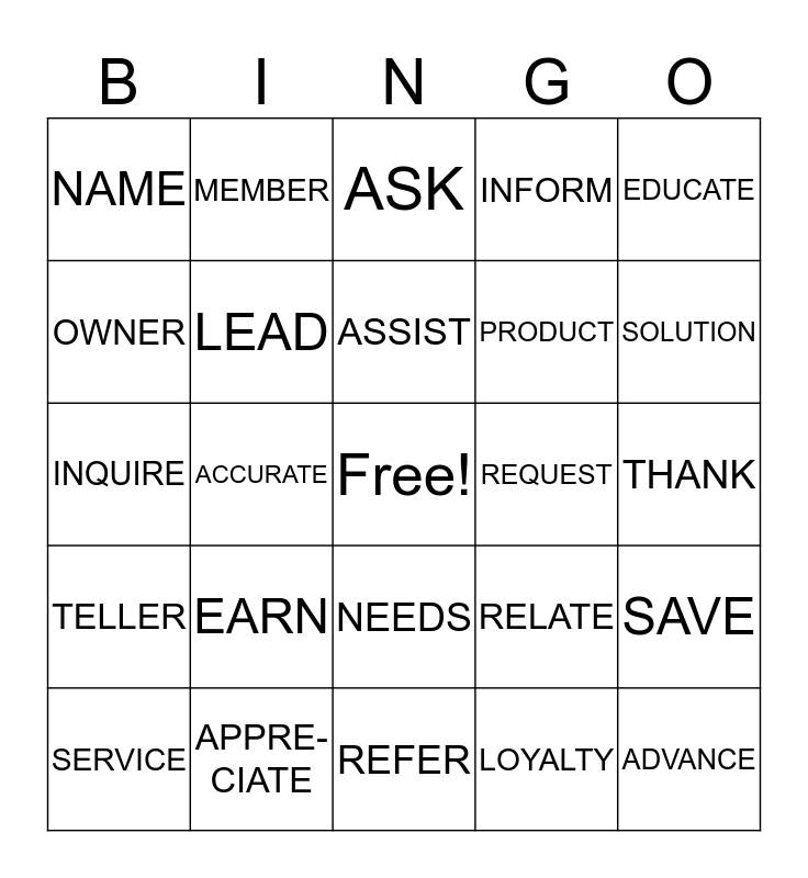 This bingo card has a free space and 24 words: EARN, APPRE-CIATE, ASSIST, SERVICE, EDUCATE, NAME, OWNER, MEMBER, REQUEST, NEEDS, PRODUCT, INQUIRE, RELATE, SAVE, LEAD, LOYALTY, THANK, ASK, SOLUTION, ACCURATE, ADVANCE, TELLER, INFORM and REFER.