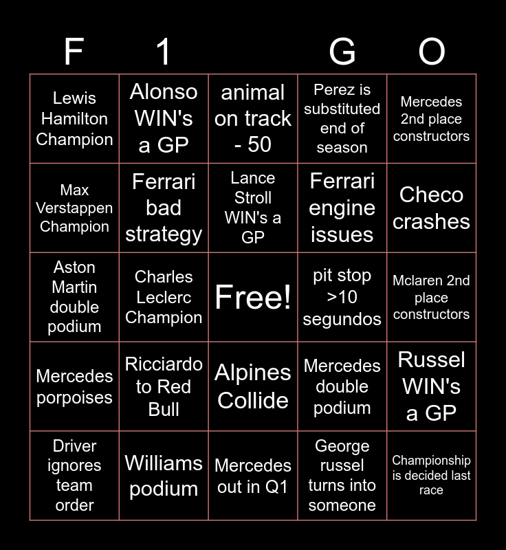 This bingo card has a free space and 67 words: Charles is unlucky, Norris WIN's a GP, Piastri WIN's a GP, Russel WIN's a GP, Hamilton WIN's a GP, Checo WIN's a GP, Alonso WIN's a GP, Ricciardo podium, Lance Stroll WIN's a GP, Ricciardo performs well during season, Alpines Collide, Red bull win's at least half of races, Mclaren 2nd place constructors, Mercedes 2nd place constructors, Aston Martin 2nd place constructors, Max Verstappen Champion, Charles Leclerc Champion, Lewis Hamilton Champion, Checo Perez under perform, Ferrari engine issues, Ricciardo to Red Bull, Mercedes porpoises, Perez is substituted end of season, George russel turns into someone, Sargeant crashes, Magnussen crashes - 25, Hulkenberg crashes, Sainz crashes, Checo crashes, Hamilton thanks the amazing croud, Championship is decided last race, A race with at least 2 red flags, A race with at least 3 yellow flags, A race with at least 2 yellow flags and 1 red, Lance Stroll in Q3, Driver ignores team order, McLaren double podium, Mercedes double podium, Aston Martin double podium, Ferrari 1-2, Redbull 1-2, Ferrari bad strategy, pit stop >10 segundos, No DNF's in a race, Alpine podium, Max Grand Slam, Max Hat-Trick, Williams podium, Williams in Q3, Max podcast without max, animal on track - 50, Radio swearing, 3 world Champions podium, Max breaks a record, Red Bull out in Q1, Mercedes out in Q1, Ferrari out in Q1, 5 Grid penalties troughout the season, team fakes a pit stop, Extra formation lap, No red bull on podium, First time pole, New Wolrd Champion, Hass in Q3, Yuki gets a podium, Williams double-points and Hass double points finish.