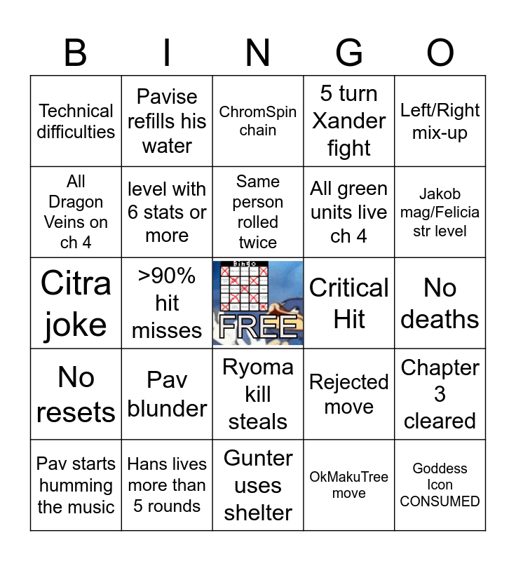 This bingo card has a free space and 24 words: Pav starts humming the music, Pav blunder, Same person rolled twice, OkMakuTree move, Left/Right mix-up, Technical difficulties, Pavise refills his water, ChromSpin chain, Critical Hit, No deaths, Citra joke, level with 6 stats or more, Rejected move, Chapter 3 cleared, All Dragon Veins on ch 4, Hans lives more than 5 rounds, Gunter uses shelter, 5 turn Xander fight, Jakob mag/Felicia str level, No resets, >90% hit misses, Ryoma kill steals, All green units live ch 4 and Goddess Icon CONSUMED.