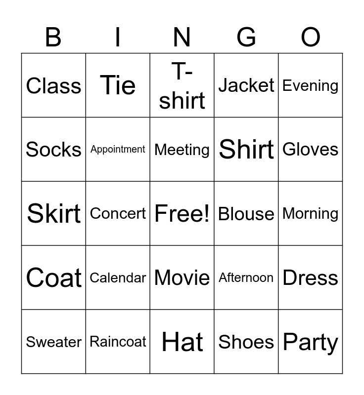This bingo card has a free space and 28 words: Dress, Pants, Shirt, Shoes, Socks, T-shirt, Tie, Coat, Blouse, Sweater, Skirt, Jacket, Raincoat, Hat, Gloves, Scarf, Calendar, Appointment, Meeting, Movie, Class, TV Show, Party, Concert, Morning, Afternoon, Evening and Night.