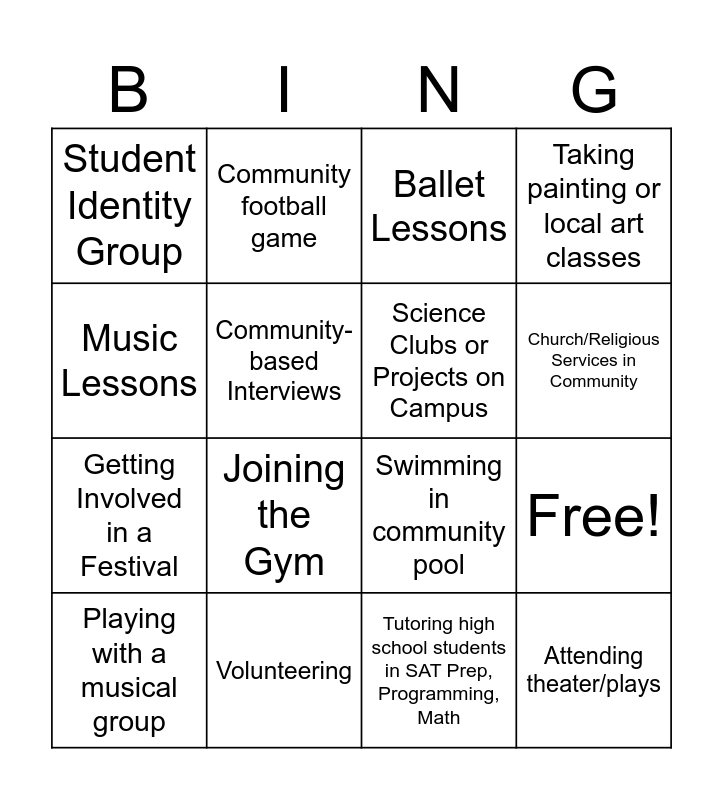 This bingo card has 20 words: Free!, Going to game of Football Club, Ballet Lessons, Joining dance group, Playing with a musical group, Music Lessons, Volunteering, Student Identity Group, Getting Involved in a Festival, Community football game, Joining the Gym, Swimming in community pool, Community-based Interviews, Attending theater/plays, Science Clubs or Projects on Campus, Orchestra/Music Performances, Church/Religious Services in Community, Taking painting or local art classes, Tutoring high school students in SAT Prep, Programming, Math and Attend cultural celebrations.