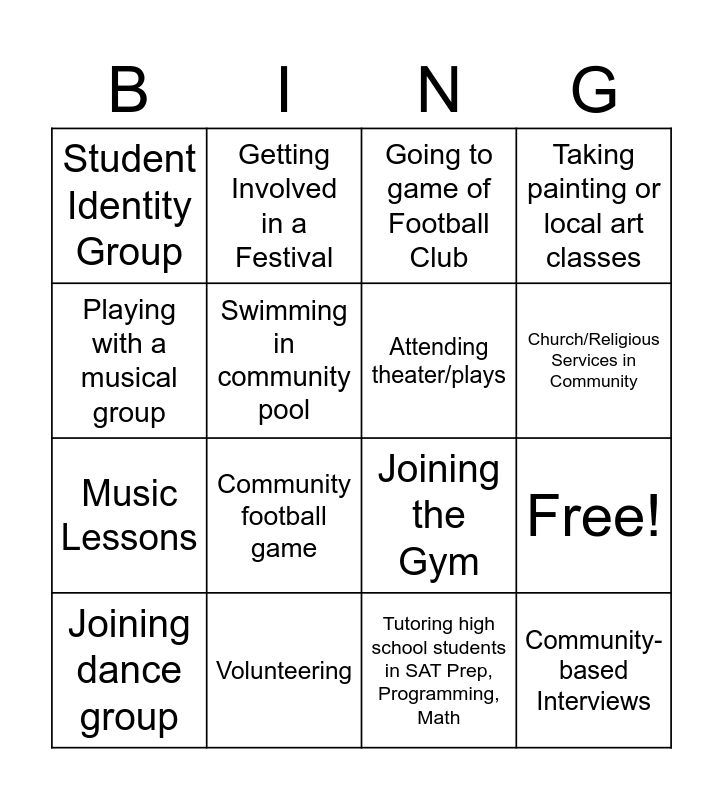 This bingo card has 20 words: Free!, Orchestra/Music Performances, Going to game of Football Club, Ballet Lessons, Joining dance group, Playing with a musical group, Volunteering, Student Identity Group, Music Lessons, Getting Involved in a Festival, Community football game, Joining the Gym, Swimming in community pool, Community-based Interviews, Attending theater/plays, Science Clubs or Projects on Campus, Church/Religious Services in Community, Taking painting or local art classes, Tutoring high school students in SAT Prep, Programming, Math and Attend cultural celebrations.
