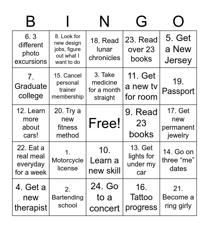 This bingo card has a free space and 24 words: 1. Motorcycle license, 2. Bartending school, 3. Take medicine for a month straight, 4. Get a new therapist, 5. Get a New Jersey, 6. 3 different photo excursions, 7. Graduate college, 8. Look for new design jobs, figure out what I want to do, 9. Read 23 books, 10. Learn a new skill, 11. Get a new tv for room, 12. Learn more about cars!, 13. Get lights for under my car, 14. Go on three “me” dates, 15. Cancel personal trainer membership, 16. Tattoo progress, 17. Get new permanent jewelry, 18. Read lunar chronicles, 19. Passport, 20. Try a new fitness method, 21. Become a ring girly, 22. Eat a real meal everyday for a week, 23. Read over 23 books and 24. Go to a concert.