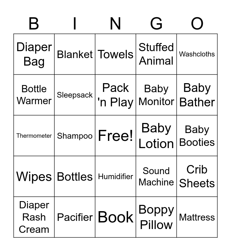 This bingo card has a free space and 24 words: Bottles, Pacifier, Pack 'n Play, Diaper Rash Cream, Washcloths, Diaper Bag, Bottle Warmer, Blanket, Baby Lotion, Humidifier, Baby Monitor, Thermometer, Sound Machine, Crib Sheets, Sleepsack, Boppy Pillow, Baby Booties, Towels, Baby Bather, Shampoo, Mattress, Wipes, Stuffed Animal and Book.