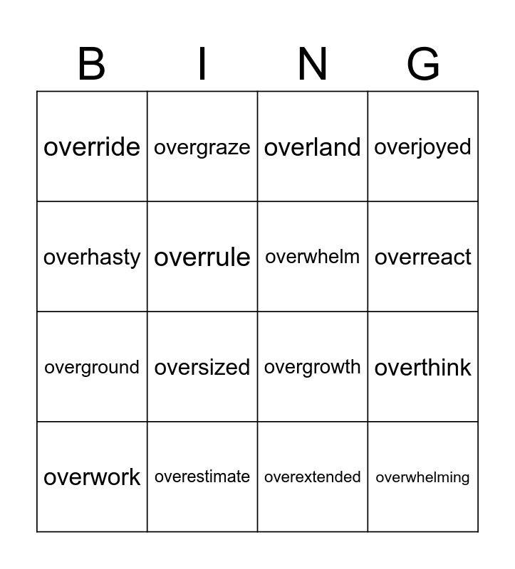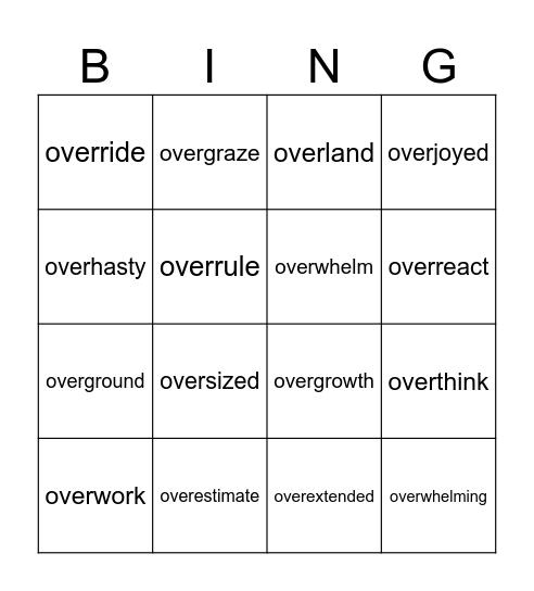 This bingo card has 24 words: overanxious, oversimplify, overreact, overturn, overhasty, override, overrule, overgraze, overestimate, overextend, overground, overgrowth, overshore, overuse, overwhelm, overabundance, overextended, overland, oversized, overthink, overwork, overwhelming, overjoyed and overheated.