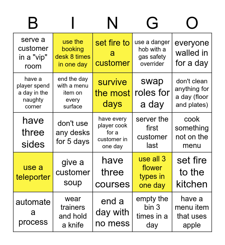 This bingo card has 25 words: give a customer soup, end a day with no mess, survive the most days, automate a process, everyone walled in for a day, serve a customer in a "vip" room, have a player spend a day in the naughty corner, use the booking desk 8 times in one day, server the first customer last, have three courses, swap roles for a day, have three sides, use all 3 flower types in one day, set fire to the kitchen, end the day with a menu item on every surface, have a menu item that uses apple, cook something not on the menu, set fire to a customer, don't clean anything for a day (floor and plates), don't use any desks for 5 days, have every player cook for a customer in one day, wear trainers and hold a knife, use a teleporter, use a danger hob with a gas safety overrider and empty the bin 3 times in a day.