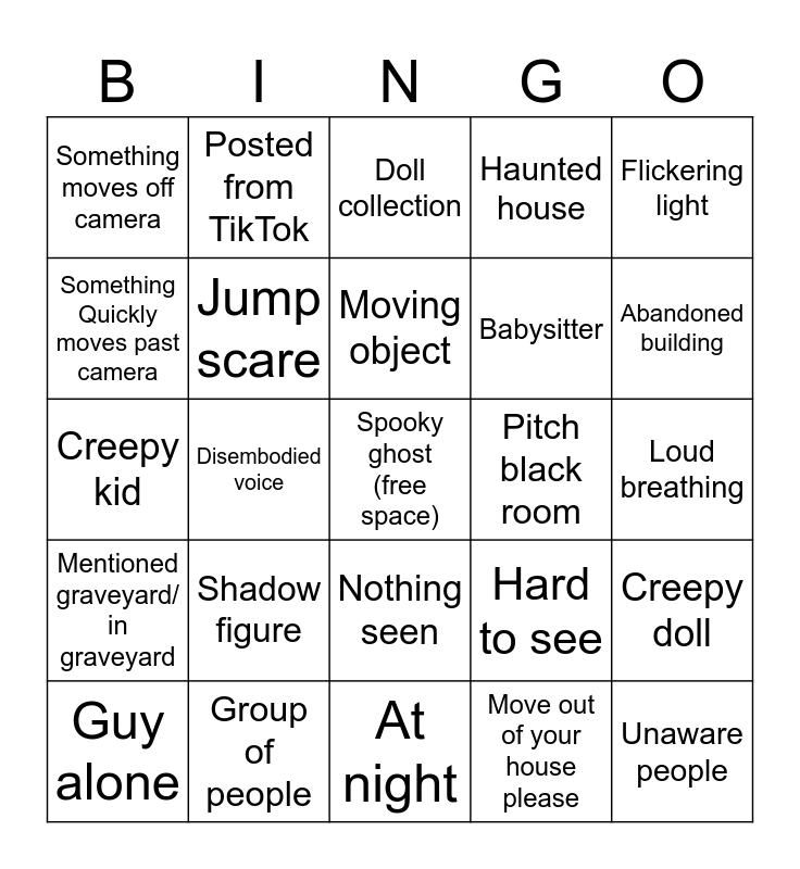 This bingo card has a free space and 25 words: Shadow figure, At night, Moving object, Guy alone, Flickering light, Something moves off camera, Something Quickly moves past camera, Posted from TikTok, Pitch black room, Nothing seen, Babysitter, Creepy kid, Hard to see, Creepy doll, Jump scare, Animal behaves weirdly, Loud breathing, Doll collection, Abandoned building, Disembodied voice, Unaware people, Group of people, Mentioned graveyard/ in graveyard, Haunted house and Move out of your house please.