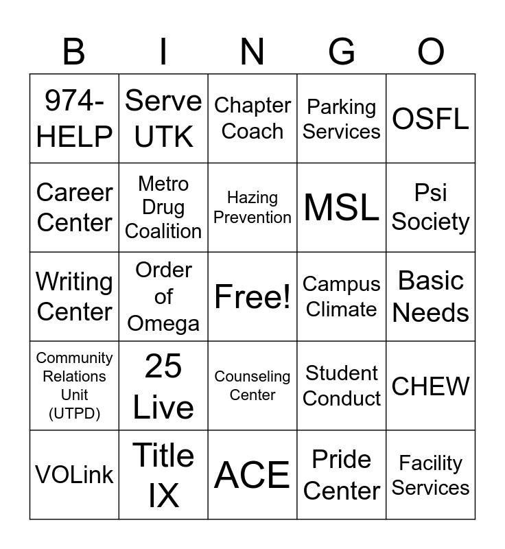 This bingo card has a free space and 24 words: 25 Live, Title IX, Hazing Prevention, VOLink, OSFL, 974-HELP, Career Center, Serve UTK, Campus Climate, Counseling Center, MSL, Writing Center, Student Conduct, CHEW, Metro Drug Coalition, Pride Center, Basic Needs, Chapter Coach, Psi Society, Order of Omega, Facility Services, Community Relations Unit (UTPD), Parking Services and ACE.