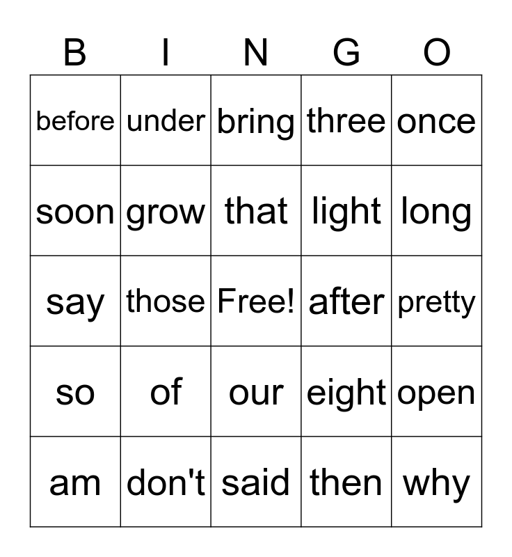 This bingo card has a free space and 24 words: of, don't, that, am, once, before, soon, under, after, our, light, say, eight, open, grow, then, pretty, bring, long, those, why, so, three and said.