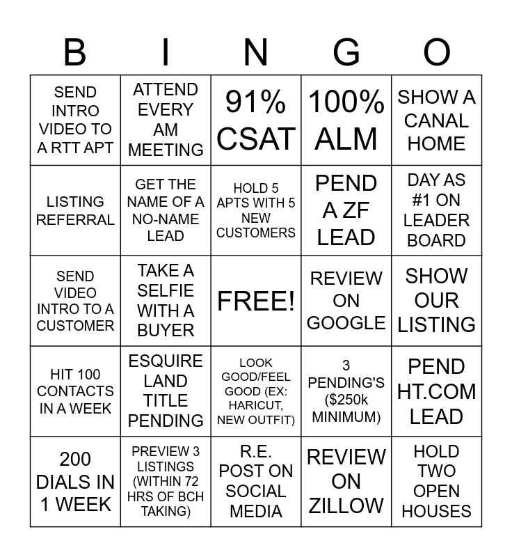 This bingo card has a free space and 24 words: ESQUIRE LAND TITLE PENDING, PREVIEW 3 LISTINGS (WITHIN 72 HRS OF BCH TAKING), HOLD 5 APTS WITH 5 NEW CUSTOMERS, 200 DIALS IN 1 WEEK, SHOW A CANAL HOME, SEND INTRO VIDEO TO A RTT APT, LISTING REFERRAL, ATTEND EVERY AM MEETING, REVIEW ON GOOGLE, LOOK GOOD/FEEL GOOD (EX: HARICUT, NEW OUTFIT), PEND A ZF LEAD, SEND VIDEO INTRO TO A CUSTOMER, 3 PENDING'S ($250k MINIMUM), PEND HT.COM LEAD, GET THE NAME OF A NO-NAME LEAD, REVIEW ON ZILLOW, SHOW OUR LISTING, 91% CSAT, DAY AS #1 ON LEADER BOARD, TAKE A SELFIE WITH A BUYER, HOLD TWO OPEN HOUSES, HIT 100 CONTACTS IN A WEEK, 100% ALM and R.E. POST ON SOCIAL MEDIA.