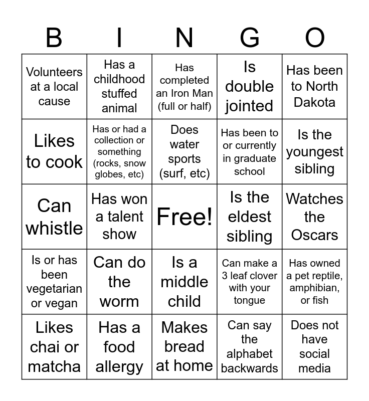 This bingo card has a free space and 24 words: Can do the worm, Has a food allergy, Does water sports (surf, etc), Likes chai or matcha, Has been to North Dakota, Volunteers at a local cause, Likes to cook, Has a childhood stuffed animal, Is the eldest sibling, Is a middle child, Has been to or currently in graduate school, Can whistle, Can make a 3 leaf clover with your tongue, Has owned a pet reptile, amphibian, or fish, Has or had a collection or something (rocks, snow globes, etc), Can say the alphabet backwards, Watches the Oscars, Has completed an Iron Man (full or half), Is the youngest sibling, Has won a talent show, Does not have social media, Is or has been vegetarian or vegan, Is double jointed and Makes bread at home.