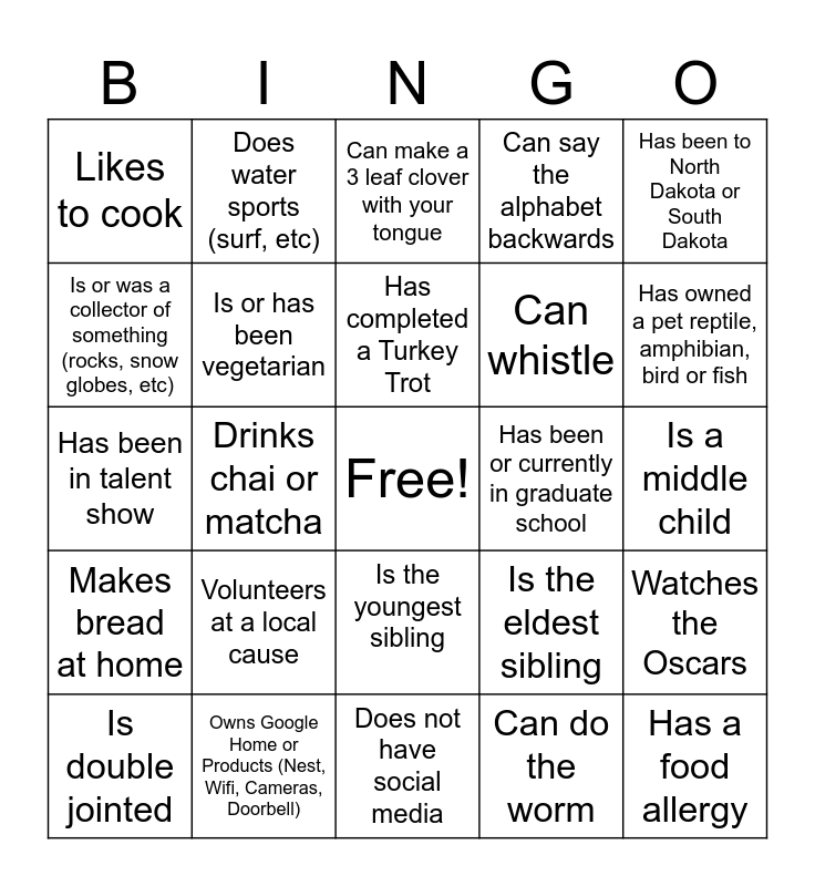 This bingo card has a free space and 24 words: Volunteers at a local cause, Owns Google Home or Products (Nest, Wifi, Cameras, Doorbell), Has completed a Turkey Trot, Is double jointed, Has been to North Dakota or South Dakota, Likes to cook, Is or was a collector of something (rocks, snow globes, etc), Does water sports (surf, etc), Has been or currently in graduate school, Is the youngest sibling, Can whistle, Has been in talent show, Is the eldest sibling, Watches the Oscars, Is or has been vegetarian, Can do the worm, Is a middle child, Can make a 3 leaf clover with your tongue, Has owned a pet reptile, amphibian, bird or fish, Drinks chai or matcha, Has a food allergy, Makes bread at home, Can say the alphabet backwards and Does not have social media.