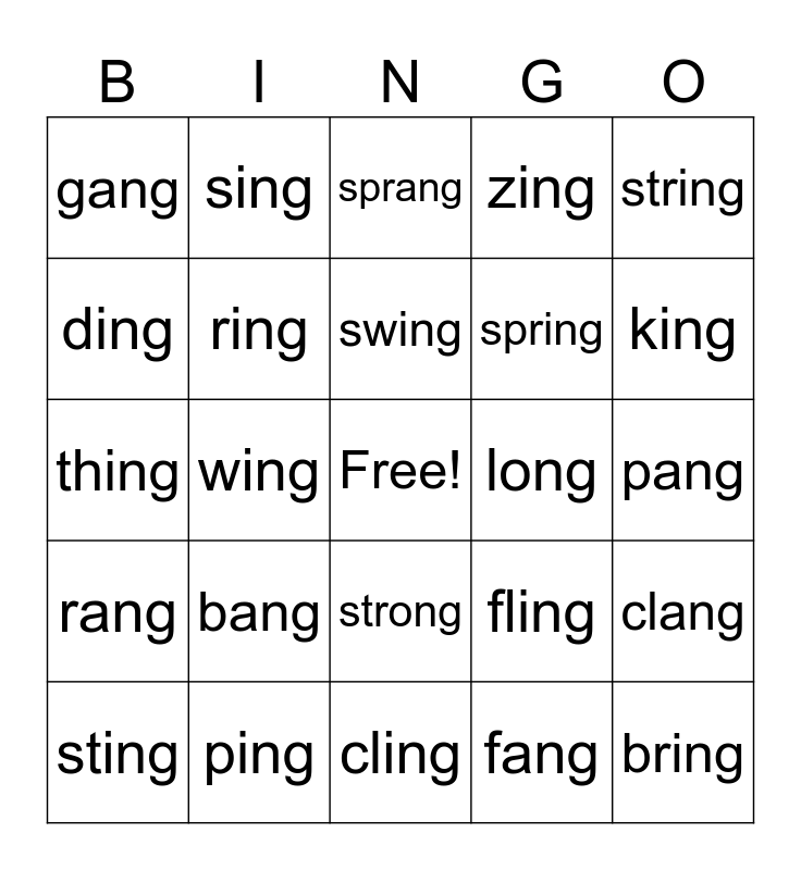 This bingo card has a free space and 24 words: bang, ping, swing, sting, string, gang, ding, sing, long, strong, spring, thing, fling, clang, ring, fang, pang, sprang, king, wing, bring, rang, zing and cling.