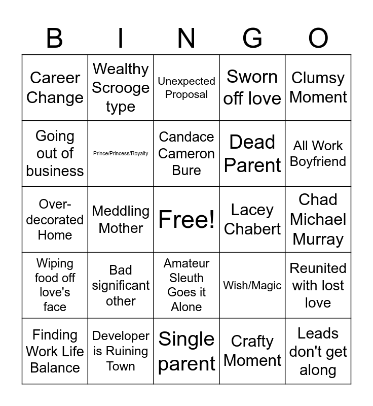 This bingo card has a free space and 48 words: Chance encounter/meet-cute, Leads don't get along, Travel problems, Single parent, Bad significant other, Fake relationship, Wealthy Scrooge type, Return to hometown, Going out of business, Mistaken identity, Prince/Princess/Royalty, Sworn off love, Reunited with lost love, Wish/Magic, Set in a shop/store, Misunderstanding Breakup, Candace Cameron Bure, Lacey Chabert, Divorced Parents, Clumsy Moment, Meddling Mother, Crafty Moment, Career Change, Dead Parent, Corporate Big Shot Villain, All Work Boyfriend, Finding Work Life Balance, Interrupted First Kiss, Amateur Sleuth Goes it Alone, Wiping food off love's face, No Communication Breakup, Opening Shot City Arial, Career Woman - No Time for Life, Main Character is an Artist, Developer is Ruining Town, Flannel, Baking Scene, Chad Michael Murray, Money Troubles, Cute Coffee Shop, Fireplace Romance, Hired Boy/Girlfriend, Unexpected Proposal, Ends with a Kiss, Over-decorated Home, My Secret Spot, Empty Coffee Cup Prop and Stole it's Plot From another Movie.