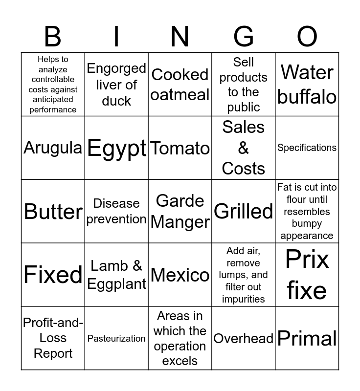 This bingo card has a free space and 24 words: Lamb & Eggplant, Pasteurization, Tomato, Profit-and-Loss Report, Water buffalo, Helps to analyze controllable costs against anticipated performance, Arugula, Engorged liver of duck, Grilled, Mexico, Sales & Costs, Butter, Add air, remove lumps, and filter out impurities, Prix fixe, Egypt, Overhead, Fat is cut into flour until resembles bumpy appearance, Cooked oatmeal, Specifications, Disease prevention, Primal, Fixed, Sell products to the public and Areas in which the operation excels.