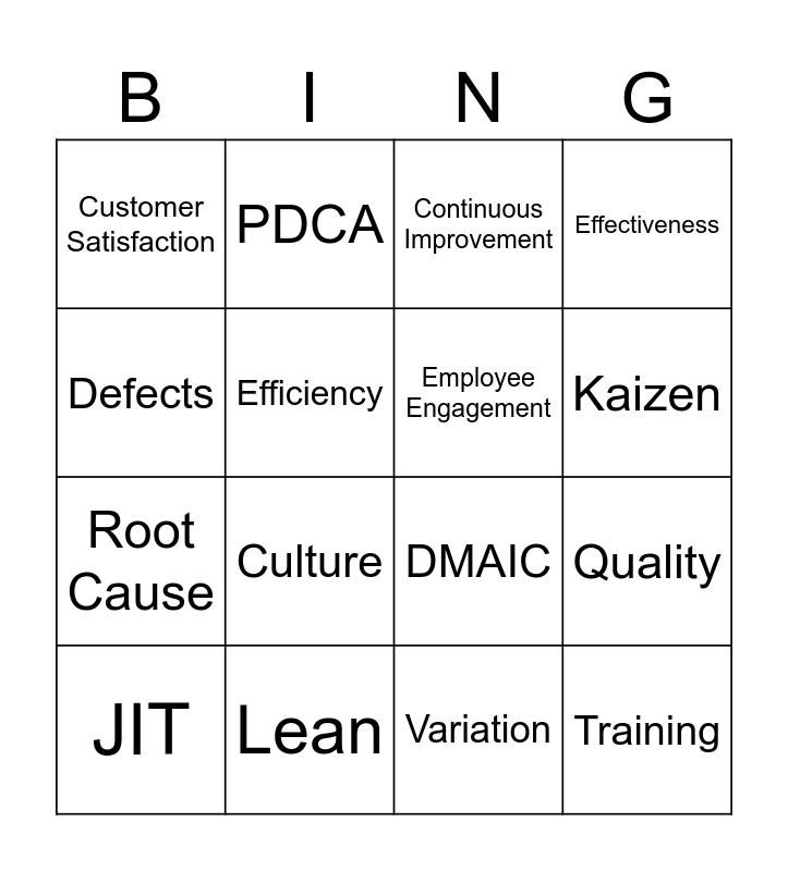 This bingo card has 16 words: Lean, Quality, Continuous Improvement, Customer Satisfaction, Root Cause, PDCA, DMAIC, Variation, Defects, Efficiency, JIT, Effectiveness, Culture, Kaizen, Employee Engagement and Training.