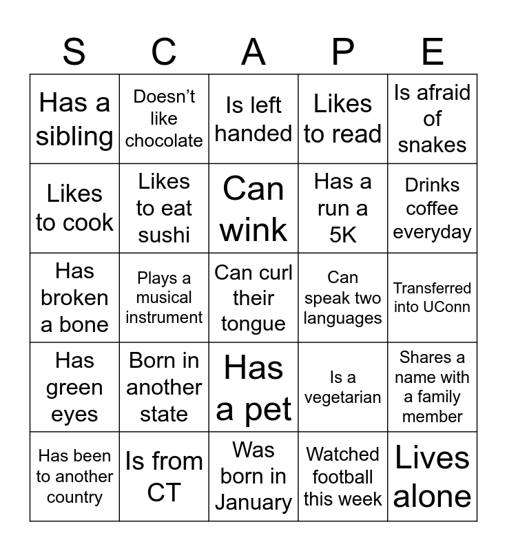 This bingo card has 30 words: Is from CT, Plays a sport, Plays a musical instrument, Likes to eat pizza, Has a sibling, Is left handed, Likes to eat sushi, Has a pet, Can speak two languages, Was born in January, Transferred into UConn, Can curl their tongue, Watched football this week, Lives alone, Drinks coffee everyday, Went camping last summer, Is a vegetarian, Has green eyes, Born in another state, Is afraid of snakes, Has broken a bone, Is wearing orange, Doesn’t like chocolate, Has a run a 5K, Likes to cook, Likes to read, Shares a name with a family member, Has been to another country, Can wink and Likes to draw.