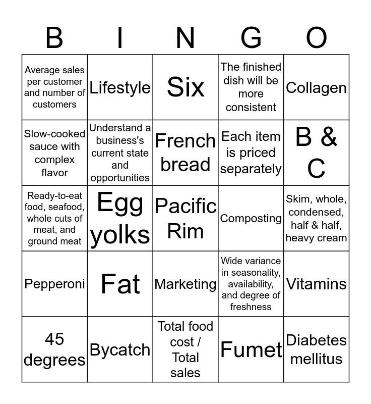 This bingo card has a free space and 24 words: Fat, Bycatch, French bread, 45 degrees, Collagen, Average sales per customer and number of customers, Slow-cooked sauce with complex flavor, Lifestyle, Composting, Marketing, Each item is priced separately, Ready-to-eat food, seafood, whole cuts of meat, and ground meat, Wide variance in seasonality, availability, and degree of freshness, Vitamins, Understand a business's current state and opportunities, Fumet, Skim, whole, condensed, half & half, heavy cream, Six, B & C, Egg yolks, Diabetes mellitus, Pepperoni, The finished dish will be more consistent and Total food cost / Total sales.