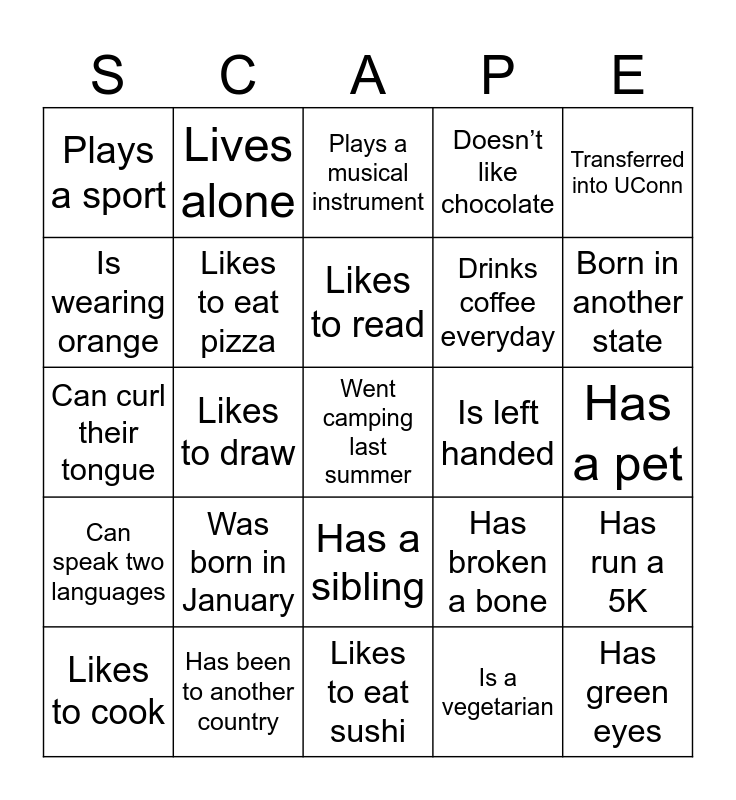 This bingo card has 30 words: Has been to another country, Can wink, Likes to draw, Is from CT, Plays a sport, Plays a musical instrument, Likes to eat pizza, Has a sibling, Is left handed, Likes to eat sushi, Has a pet, Went camping last summer, Is a vegetarian, Has green eyes, Born in another state, Is afraid of snakes, Has broken a bone, Can speak two languages, Was born in January, Transferred into UConn, Can curl their tongue, Watched football this week, Lives alone, Drinks coffee everyday, Is wearing orange, Doesn’t like chocolate, Has run a 5K, Likes to cook, Likes to read and Shares a name with a family member.