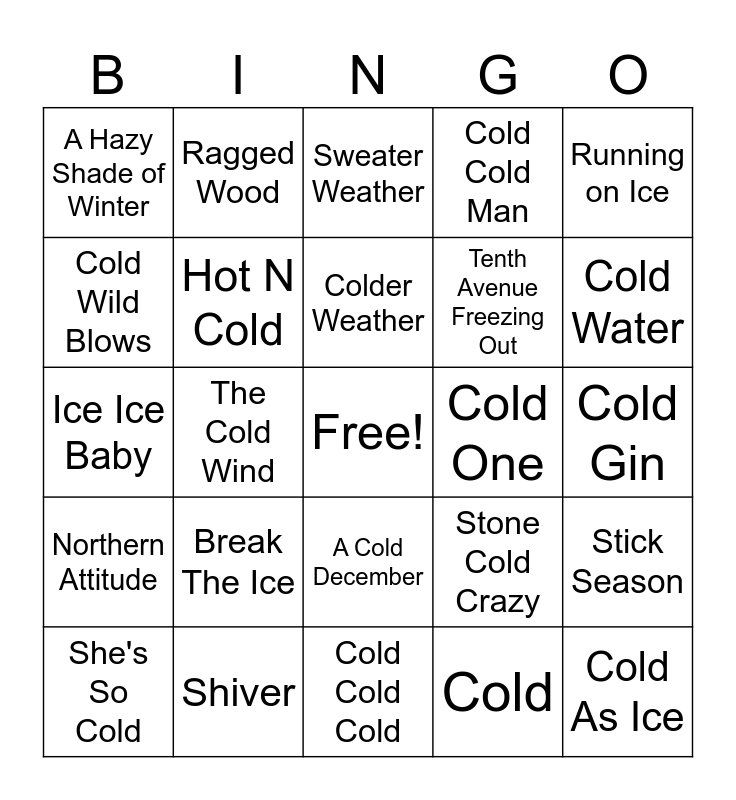 This bingo card has a free space and 24 words: Break The Ice, Shiver, Colder Weather, She's So Cold, Running on Ice, A Hazy Shade of Winter, Cold Wild Blows, Ragged Wood, Cold One, A Cold December, Tenth Avenue Freezing Out, Ice Ice Baby, Stone Cold Crazy, Stick Season, Hot N Cold, Cold, Cold Gin, Sweater Weather, Cold Water, The Cold Wind, Cold As Ice, Northern Attitude, Cold Cold Man and Cold Cold Cold.
