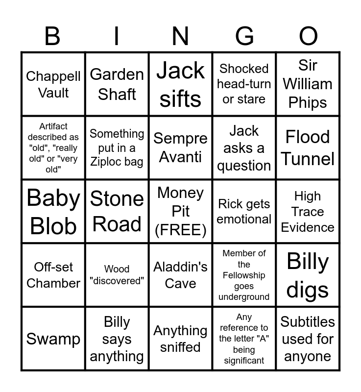 This bingo card has a free space and 24 words: Swamp, Wood "discovered", Sempre Avanti, Any reference to the letter "A" being significant, Sir William Phips, Chappell Vault, Garden Shaft, Jack sifts, Rick gets emotional, High Trace Evidence, Baby Blob, Something put in a Ziploc bag, Member of the Fellowship goes underground, Billy digs, Artifact described as "old", "really old" or "very old", Billy says anything, Anything sniffed, Shocked head-turn or stare, Flood Tunnel, Off-set Chamber, Stone Road, Aladdin's Cave, Jack asks a question and Subtitles used for anyone.