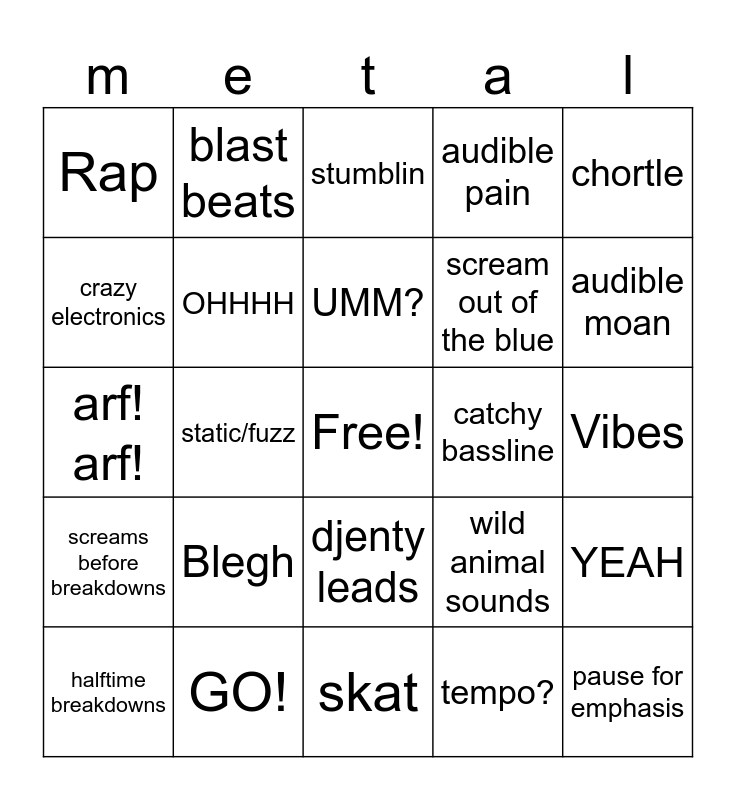 This bingo card has a free space and 24 words: Blegh, GO!, UMM?, halftime breakdowns, chortle, Rap, crazy electronics, blast beats, catchy bassline, djenty leads, scream out of the blue, arf! arf!, wild animal sounds, YEAH, OHHHH, tempo?, Vibes, stumblin, audible moan, static/fuzz, pause for emphasis, screams before breakdowns, audible pain and skat.