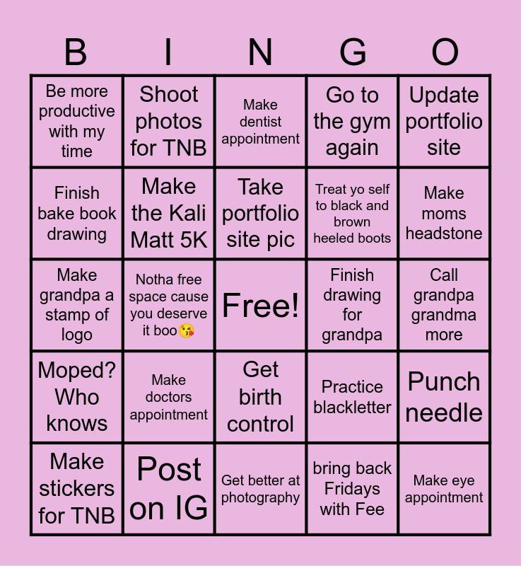 This bingo card has a free space and 24 words: Make doctors appointment, Post on IG, Take portfolio site pic, Make stickers for TNB, Update portfolio site, Be more productive with my time, Finish bake book drawing, Shoot photos for TNB, Finish drawing for grandpa, Get birth control, Treat yo self to black and brown heeled boots, Make grandpa a stamp of logo, Practice blackletter, Punch needle, Make the Kali Matt 5K, bring back Fridays with Fee, Call grandpa grandma more, Make dentist appointment, Make moms headstone, Notha free space cause you deserve it boo😘, Make eye appointment, Moped? Who knows, Go to the gym again and Get better at photography.