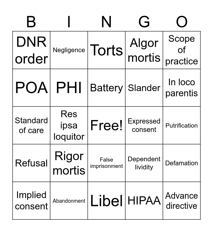 This bingo card has a free space and 29 words: Implied consent, Assault, Res ipsa loquitor, Discovery, DNR order, Torts, PHI, Rigor mortis, Expressed consent, Abandonment, Putrification, Advance directive, Libel, HIPAA, In loco parentis, Duty to act, False imprisonment, Refusal, Scope of practice, Standard of care, Dependent lividity, Emancipated minor, Slander, POA, Algor mortis, Negligence, Defamation, Battery and Kidnapping.