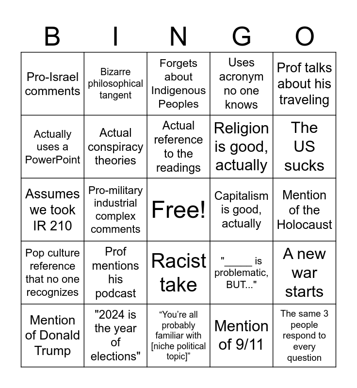 This bingo card has a free space and 24 words: Prof mentions his podcast, "2024 is the year of elections", Actual reference to the readings, Mention of Donald Trump, Prof talks about his traveling, Pro-Israel comments, Actually uses a PowerPoint, Bizarre philosophical tangent, Capitalism is good, actually, Racist take, Religion is good, actually, Assumes we took IR 210, "_____ is problematic, BUT...", A new war starts, Actual conspiracy theories, Mention of 9/11, Mention of the Holocaust, Forgets about Indigenous Peoples, The US sucks, Pro-military industrial complex comments, The same 3 people respond to every question, Pop culture reference that no one recognizes, Uses acronym no one knows and “You’re all probably familiar with [niche political topic]”.