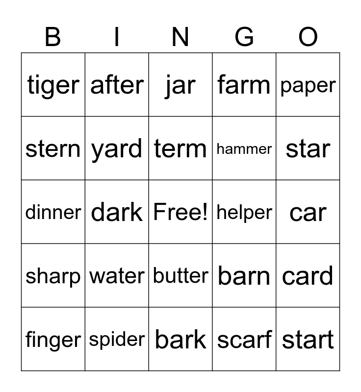 This bingo card has a free space and 24 words: water, spider, term, finger, paper, tiger, stern, after, helper, butter, hammer, dinner, barn, card, yard, scarf, car, jar, star, dark, start, sharp, farm and bark.