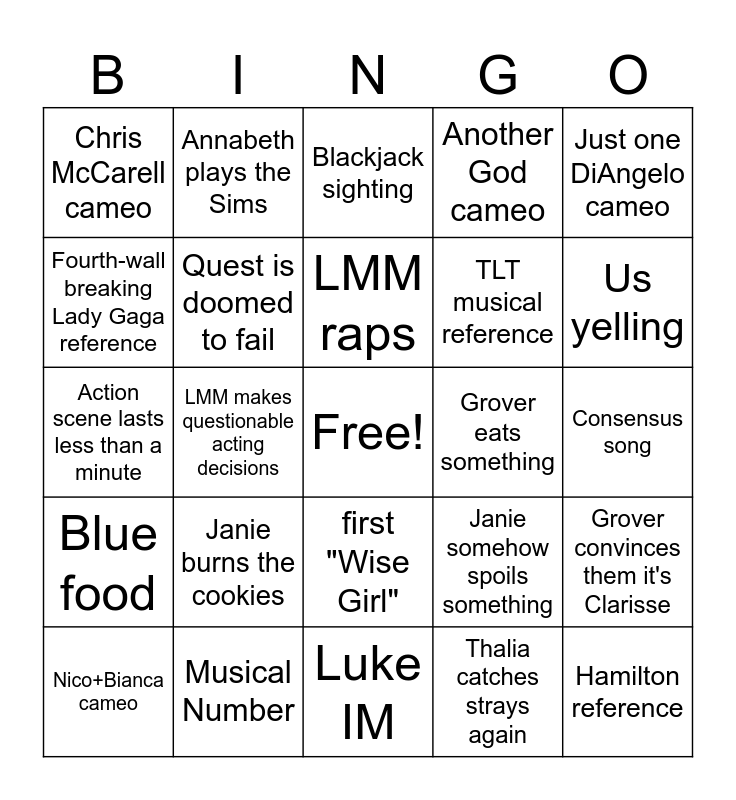 This bingo card has a free space and 24 words: Janie burns the cookies, Musical Number, LMM raps, Nico+Bianca cameo, Just one DiAngelo cameo, Chris McCarell cameo, Fourth-wall breaking Lady Gaga reference, Annabeth plays the Sims, Grover eats something, first "Wise Girl", TLT musical reference, Action scene lasts less than a minute, Janie somehow spoils something, Grover convinces them it's Clarisse, Quest is doomed to fail, Thalia catches strays again, Consensus song, Blackjack sighting, Us yelling, LMM makes questionable acting decisions, Hamilton reference, Blue food, Another God cameo and Luke IM.