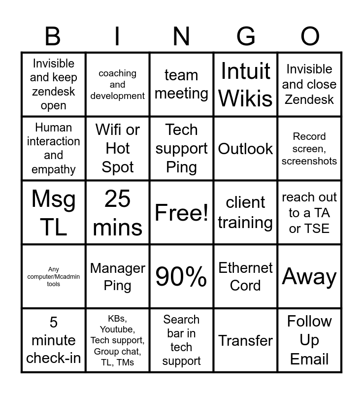 This bingo card has a free space and 24 words: 5 minute check-in, Manager Ping, Tech support Ping, Transfer, Invisible and close Zendesk, Invisible and keep zendesk open, coaching and development, team meeting, client training, reach out to a TA or TSE, Msg TL, Wifi or Hot Spot, Ethernet Cord, Away, Human interaction and empathy, KBs, Youtube, Tech support, Group chat, TL, TMs, Search bar in tech support, Intuit Wikis, Record screen, screenshots, Any computer/Mcadmin tools, 25 mins, 90%, Outlook and Follow Up Email.