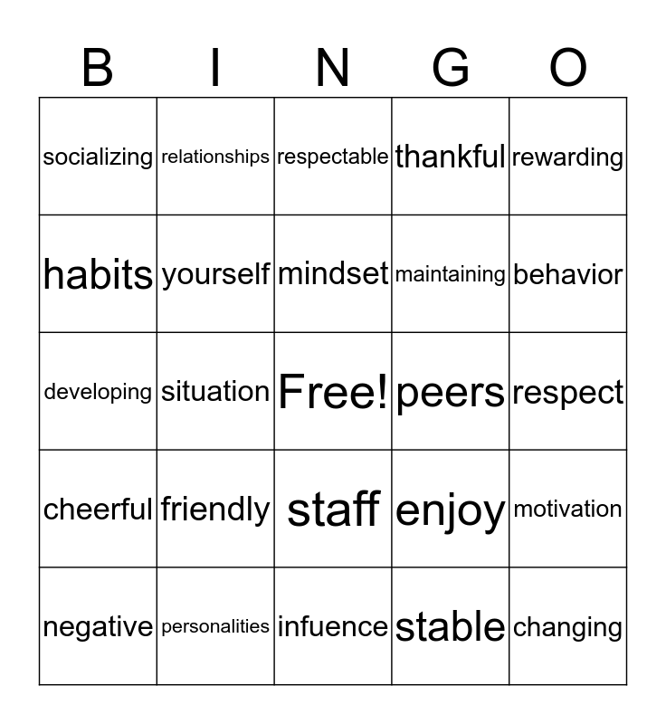 This bingo card has a free space and 24 words: friendly, personalities, mindset, negative, rewarding, socializing, habits, relationships, peers, staff, maintaining, developing, enjoy, motivation, yourself, stable, respect, respectable, behavior, situation, changing, cheerful, thankful and infuence.