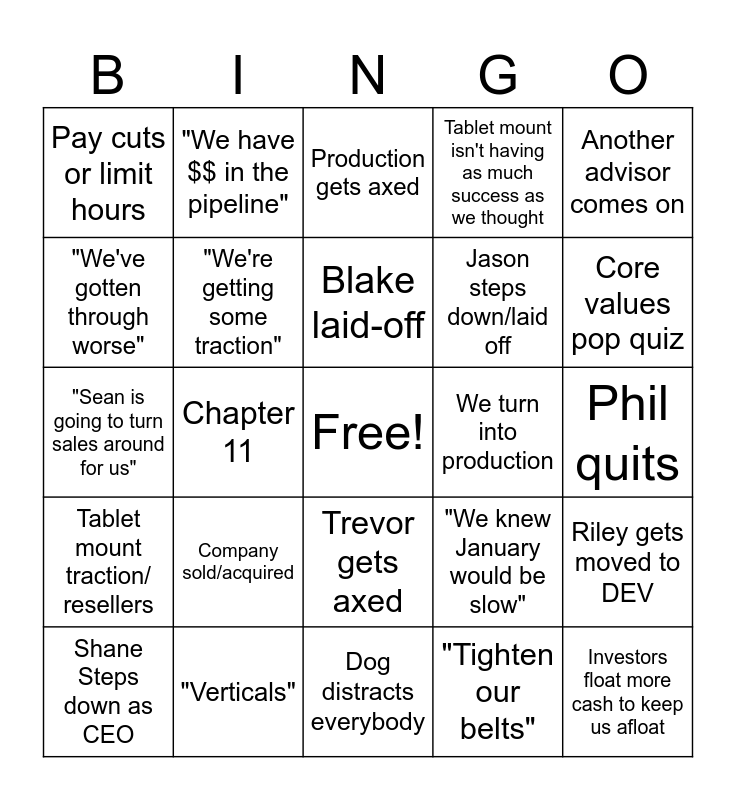 This bingo card has a free space and 24 words: Company sold/acquired, "Verticals", Blake laid-off, Shane Steps down as CEO, Another advisor comes on, Pay cuts or limit hours, "We've gotten through worse", "We have $$ in the pipeline", We turn into production, Trevor gets axed, Jason steps down/laid off, "Sean is going to turn sales around for us", "We knew January would be slow", Riley gets moved to DEV, "We're getting some traction", "Tighten our belts", Phil quits, Production gets axed, Core values pop quiz, Chapter 11, Investors float more cash to keep us afloat, Tablet mount traction/ resellers, Tablet mount isn't having as much success as we thought and Dog distracts everybody.