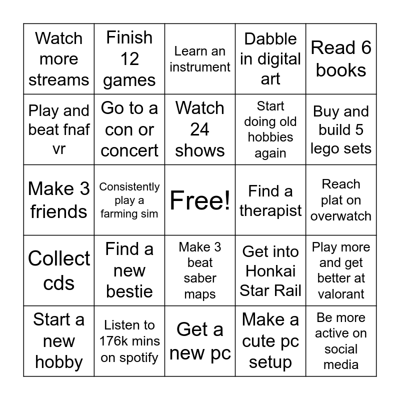 This bingo card has a free space and 24 words: Find a new bestie, Listen to 176k mins on spotify, Watch 24 shows, Start a new hobby, Read 6 books, Watch more streams, Play and beat fnaf vr, Finish 12 games, Find a therapist, Make 3 beat saber maps, Start doing old hobbies again, Make 3 friends, Get into Honkai Star Rail, Play more and get better at valorant, Go to a con or concert, Make a cute pc setup, Reach plat on overwatch, Learn an instrument, Buy and build 5 lego sets, Consistently play a farming sim, Be more active on social media, Collect cds, Dabble in digital art and Get a new pc.
