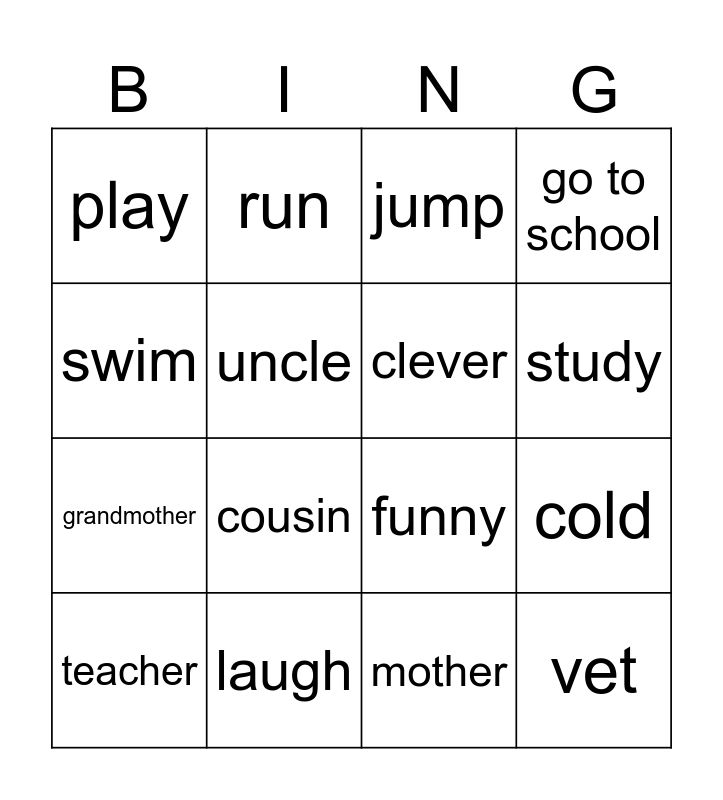 This bingo card has 16 words: laugh, cold, jump, play, grandmother, run, funny, mother, swim, uncle, teacher, go to school, cousin, study, clever and vet.