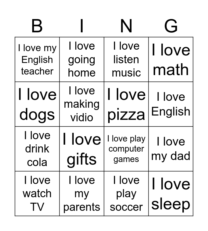 This bingo card has 20 words: I love my dad, I love my mom, I love listen music, I love my class, I love watch TV, I love dogs, I love my parents, I love my English teacher, I love drink cola, I love going home, I love gifts, I love play computer games, I love making vidio, I love sleep, I love pizza, I love Bred, I love English, I love math, I love play soccer and I love riding a bike.