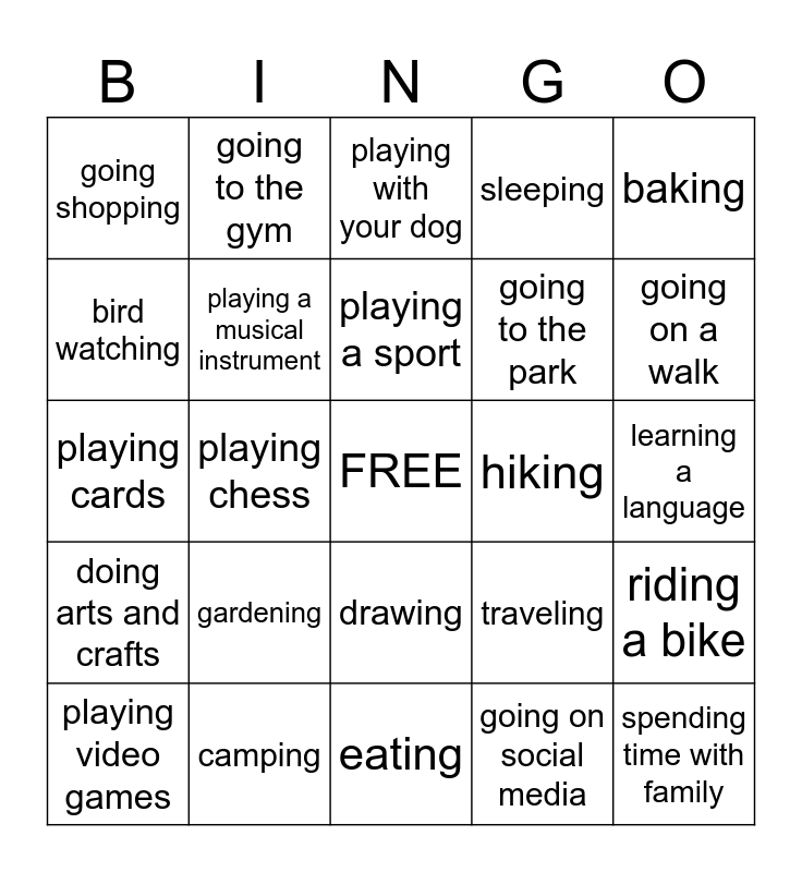 This bingo card has a free space and 28 words: riding a bike, watching a movie, going to the park, going on social media, bird watching, playing with your dog, going to the gym, doing arts and crafts, hiking, playing video games, playing cards, sleeping, camping, eating, going on a walk, going out with friends, gardening, playing a musical instrument, playing a sport, drawing, going shopping, reading, spending time with family, playing chess, learning a language, traveling, baking and cooking.