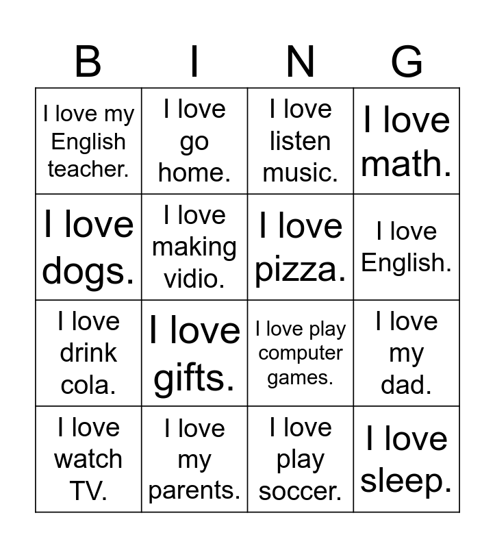 This bingo card has 20 words: I love my dad., I love my mom., I love listen music., I love my class., I love watch TV., I love dogs., I love my parents., I love my English teacher., I love drink cola., I love go home., I love gifts., I love play computer games., I love making vidio., I love sleep., I love pizza., I love Bred., I love English., I love math., I love play soccer. and I love riding a bike..