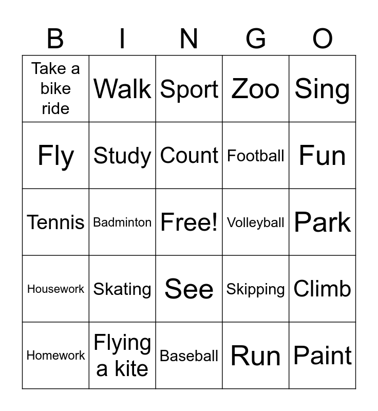 This bingo card has a free space and 24 words: Skating, Flying a kite, Count, Homework, Sing, Take a bike ride, Fly, Walk, Volleyball, See, Football, Tennis, Skipping, Climb, Study, Run, Park, Sport, Fun, Badminton, Paint, Housework, Zoo and Baseball.