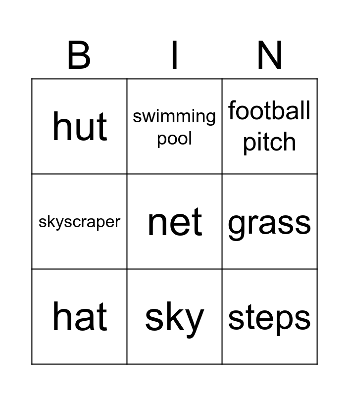 This bingo card has 9 words: hat, football pitch, swimming pool, skyscraper, hut, grass, net, steps and sky.