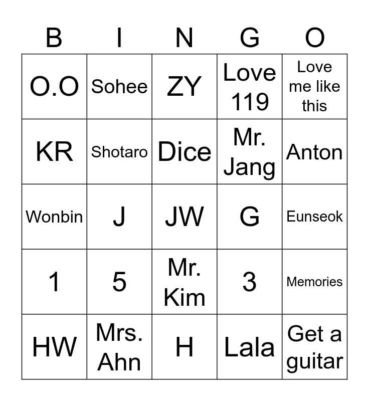 This bingo card has a free space and 24 words: 5, Mrs. Ahn, Dice, HW, Love me like this, O.O, KR, Sohee, G, Mr. Kim, Mr. Jang, Wonbin, 3, Memories, Shotaro, Lala, Eunseok, ZY, Anton, J, Get a guitar, 1, Love 119 and H.