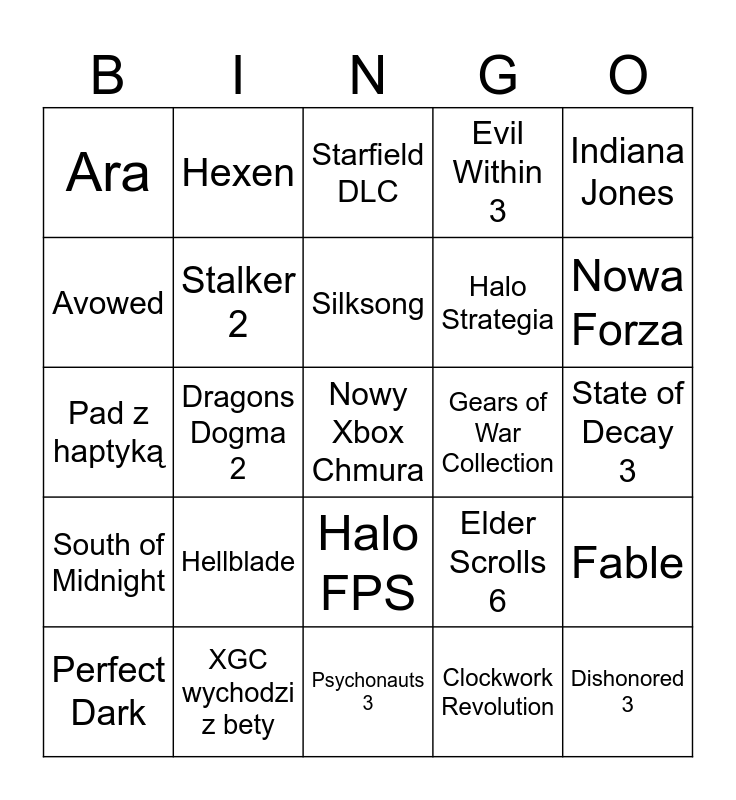 This bingo card has a free space and 24 words: Hellblade, XGC wychodzi z bety, Silksong, Perfect Dark, Indiana Jones, Ara, Avowed, Hexen, Gears of War Collection, Halo FPS, Halo Strategia, Pad z haptyką, Elder Scrolls 6, Fable, Stalker 2, Clockwork Revolution, State of Decay 3, Starfield DLC, Nowa Forza, Dragons Dogma 2, Dishonored 3, South of Midnight, Evil Within 3 and Psychonauts 3.