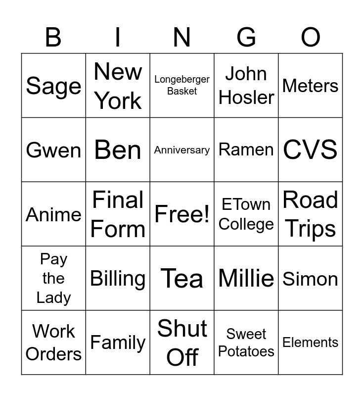 This bingo card has a free space and 24 words: Billing, Family, Anniversary, Work Orders, Meters, Sage, Gwen, New York, ETown College, Tea, Ramen, Anime, Millie, Simon, Ben, Sweet Potatoes, Road Trips, Longeberger Basket, CVS, Final Form, Elements, Pay the Lady, John Hosler and Shut Off.