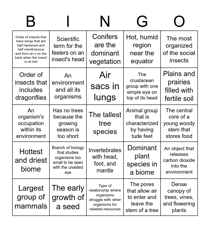 This bingo card has a free space and 24 words: Branch of biology that studies organisms too small to be seen with the unaided eye, The early growth of a seed, Air sacs in lungs, Largest group of mammals, The most organized of the social insects, Order of insects that have wings that are half hardened and half membranous and form an x on the back when the insect is at rest, Order of insects that includes dragonflies, Scientific term for the feelers on an insect's head, Animal group that is characterized by having tude feet, Invertebrates with head, foot, and mantle, The crustacean group with one simple eye on top of its head, An organism's occupation within its environment, Dominant plant species in a biome, An object that releases carbon dioxide into the environment, An environment and all its organisms, The pores that allow air to enter and leave the stem of a tree, The central core of a young woody stem that stores food, Conifers are the dominant vegetation, Plains and prairies filled with fertile soil, Has no trees because the growing season is too short, Dense canopy of trees, vines, and flowering plants, Hottest and driest biome, Hot, humid region near the equator and Type of relationship where organisms struggle with other organisms for needed resources.