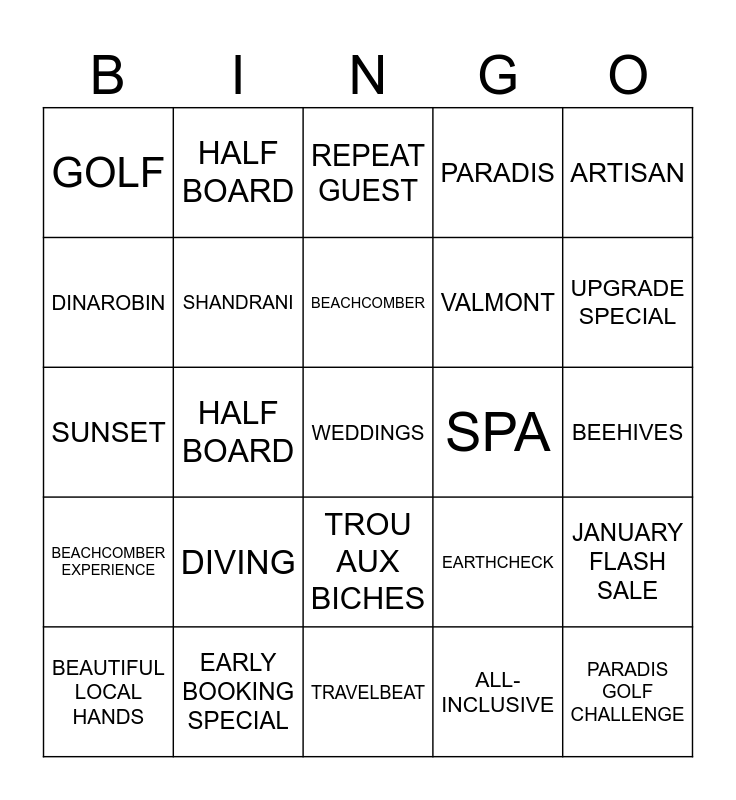 This bingo card has 35 words: MAURICIA, CANONNIER, VICTORIA, SHANDRANI, TROU AUX BICHES, PARADIS, DINAROBIN, ROYAL PALM, BEACHCOMBER, BEAUTIFUL COCKTAIL, SUNSET, ARTISAN, Free!, SUMMER, GOLF, SPA, ALL-INCLUSIVE, HALF BOARD, BEACHCOMBER EXPERIENCE, WEDDINGS, EARTHCHECK, BEAUTIFUL LOCAL HANDS, JANUARY FLASH SALE, EARLY BOOKING SPECIAL, REPEAT GUEST, UPGRADE SPECIAL, PARADIS GOLF CHALLENGE, LE MORNE, VALMONT, BEEHIVES, ECHAT, TRAVELBEAT, DIVING, HALF BOARD and ESCAPE DRINKS PACKAGE.