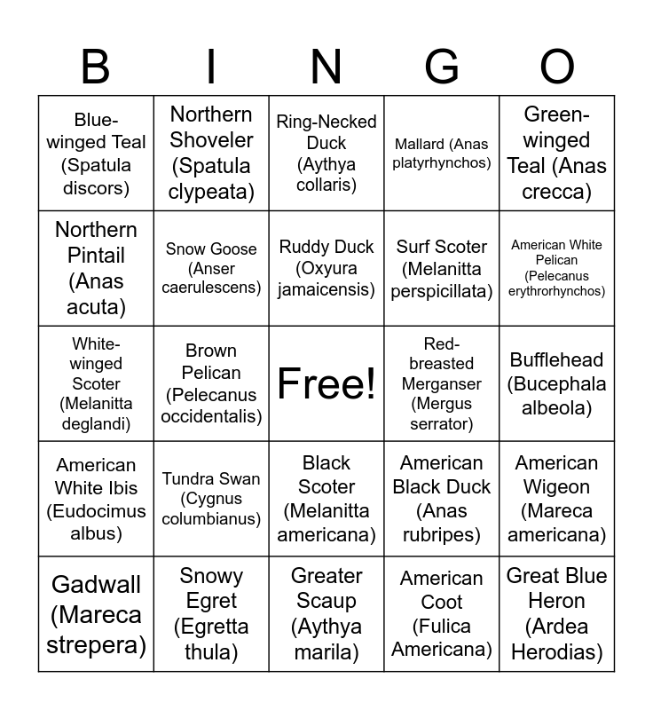 This bingo card has a free space and 25 words: Tundra Swan (Cygnus columbianus), Greater Scaup (Aythya marila), Ruddy Duck (Oxyura jamaicensis), Gadwall (Mareca strepera), Green-winged Teal (Anas crecca), Blue-winged Teal (Spatula discors), Northern Pintail (Anas acuta), Northern Shoveler (Spatula clypeata), Red-breasted Merganser (Mergus serrator), Black Scoter (Melanitta americana), Surf Scoter (Melanitta perspicillata), White-winged Scoter (Melanitta deglandi), American Black Duck (Anas rubripes), American Wigeon (Mareca americana), Snow Goose (Anser caerulescens), Canada Goose (Branta canadensis), Bufflehead (Bucephala albeola), Ring-Necked Duck (Aythya collaris), American White Pelican (Pelecanus erythrorhynchos), Brown Pelican (Pelecanus occidentalis), Great Blue Heron (Ardea Herodias), Snowy Egret (Egretta thula), American White Ibis (Eudocimus albus), Mallard (Anas platyrhynchos) and American Coot (Fulica Americana).