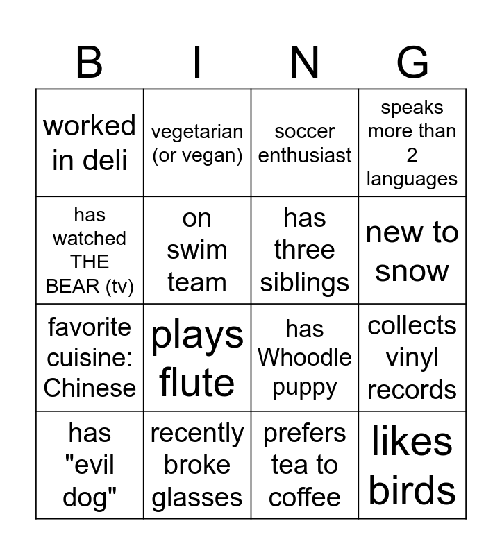 This bingo card has 20 words: collects vinyl records, grandparents had crocodile, soccer enthusiast, has acted onstage, has "evil dog", has watched THE BEAR (tv), recently broke glasses, worked in deli, favorite cuisine: Chinese, vegetarian (or vegan), plays flute, has Whoodle puppy, on swim team, likes birds, has three siblings, crochets & knits, new to snow, speaks more than 2 languages, prefers tea to coffee and photography enthusiast.