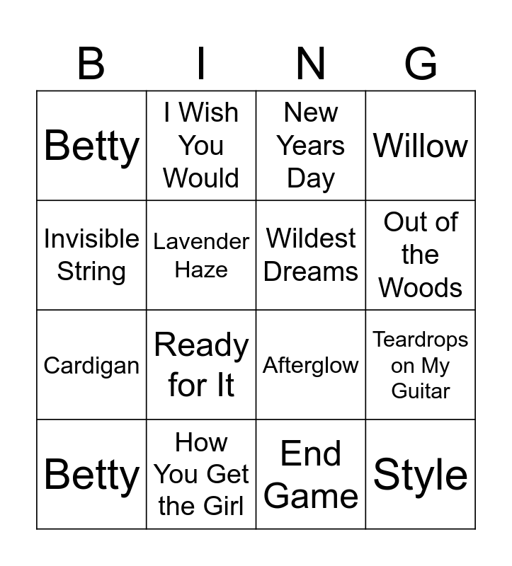 This bingo card has 20 words: Teardrops on My Guitar, Mean, New Years Day, Karma, Betty, Invisible String, How You Get the Girl, Betty, Cardigan, I Wish You Would, Ready for It, Afterglow, Lavender Haze, Style, Wildest Dreams, The Archer, Out of the Woods, Willow, End Game and Getaway Car.