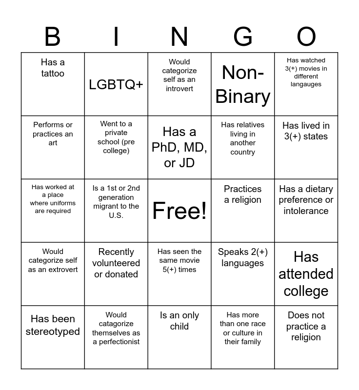 This bingo card has a free space and 29 words: Has been stereotyped, Has broken a bone, Is a 1st or 2nd generation migrant to the U.S., Has 3(+) siblings, Has a tattoo, Would categorize self as an introvert, Went to a private school (pre college), Recently volunteered or donated, Practices a religion, Would catagorize themselves as a perfectionist, Has a dietary preference or intolerance, Does not practice a religion, Is an only child, Has more than one race or culture in their family, Has lived in 3(+) states, Has participated in a study abroad, Has seen the same movie 5(+) times, Would categorize self as an extrovert, Has watched 3(+) movies in different langauges, Has worked at a place where uniforms are required, Speaks 2(+) languages, Has played on a sports team, Has relatives living in another country, Performs or practices an art, Non-Binary, LGBTQ+, Has attended college, Has a PhD, MD, or JD and Identifies as African American or Black.